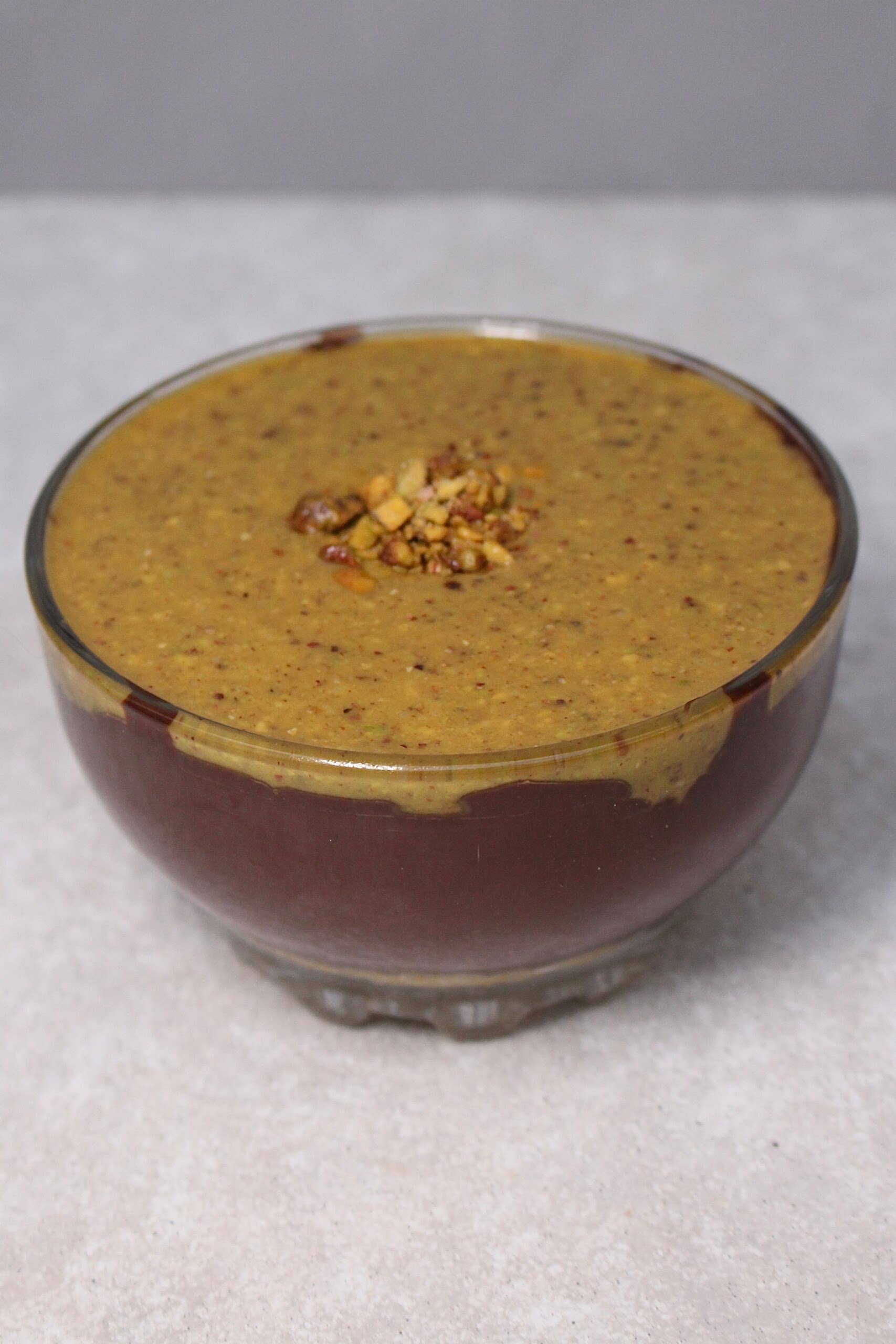 DUBAI CUP, yoğun çikolata tabanı ve Antep fıstığı bazlı kremasıyla hazırlanan modern Fransız tarzı katmanlı bir cup tatlıdır.