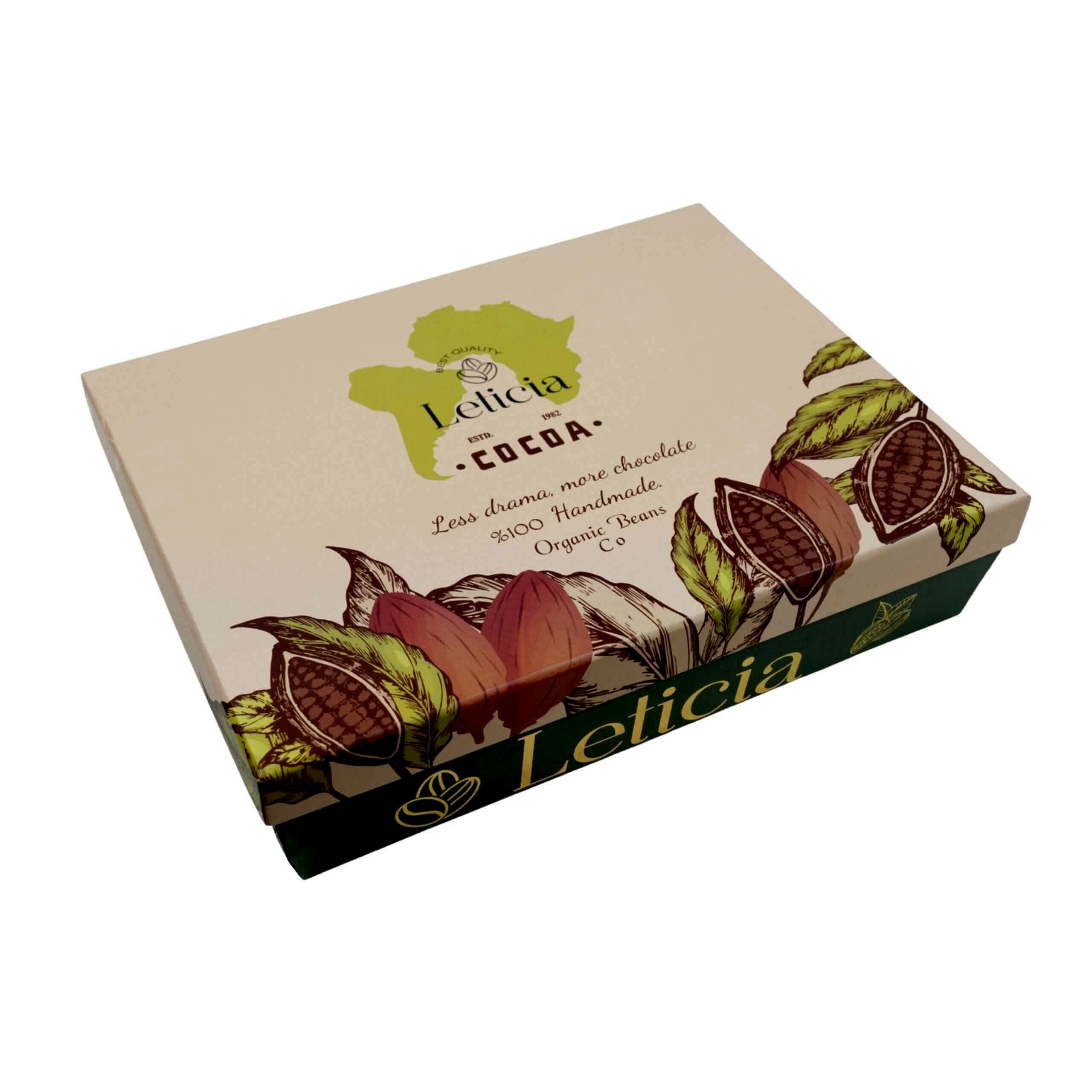 Leticia’nın yeşil-gold tasarımlı kutusu, ürünü yalnızca bir çikolata kutusu değil; aynı zamanda estetik bir hediye ve deneyim ürünü haline getirir. Minimalist dizilim, profesyonel çikolata kartelası görünümüyle marka kimliğiyle tam uyumludur.