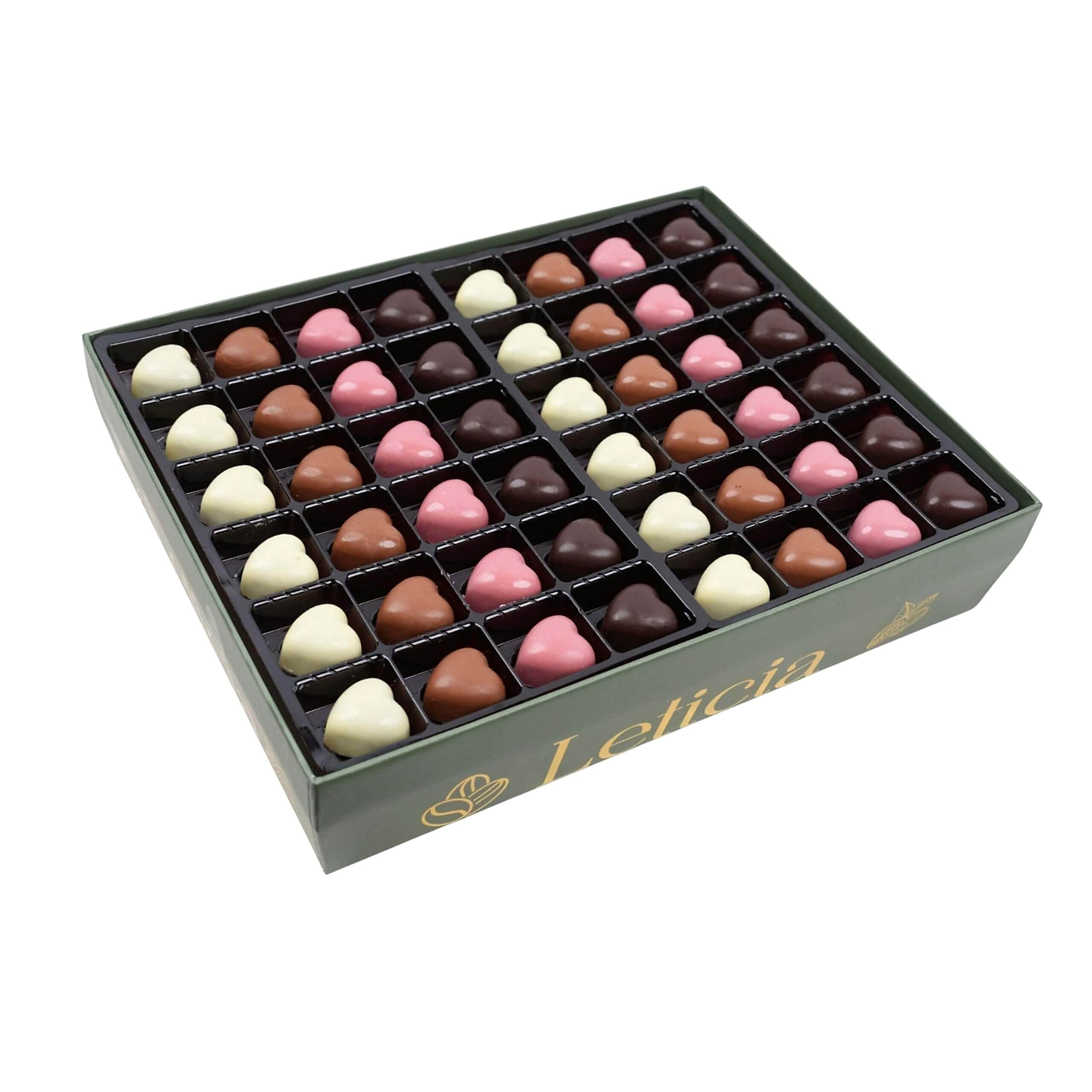 Leticia’nın yeşil-gold tasarımlı özel kutusu, Amoré’yi yalnızca bir çikolata kutusu değil; anlam taşıyan bir hediye haline getirir. Sevgililer günü, yıldönümü, özel kutlamalar veya zarif bir jest için ideal bir seçimdir. Açıldığında renkli kalp çikolataların düzenli dizilimi, ilk bakışta görsel bir mutluluk hissi yaratır.